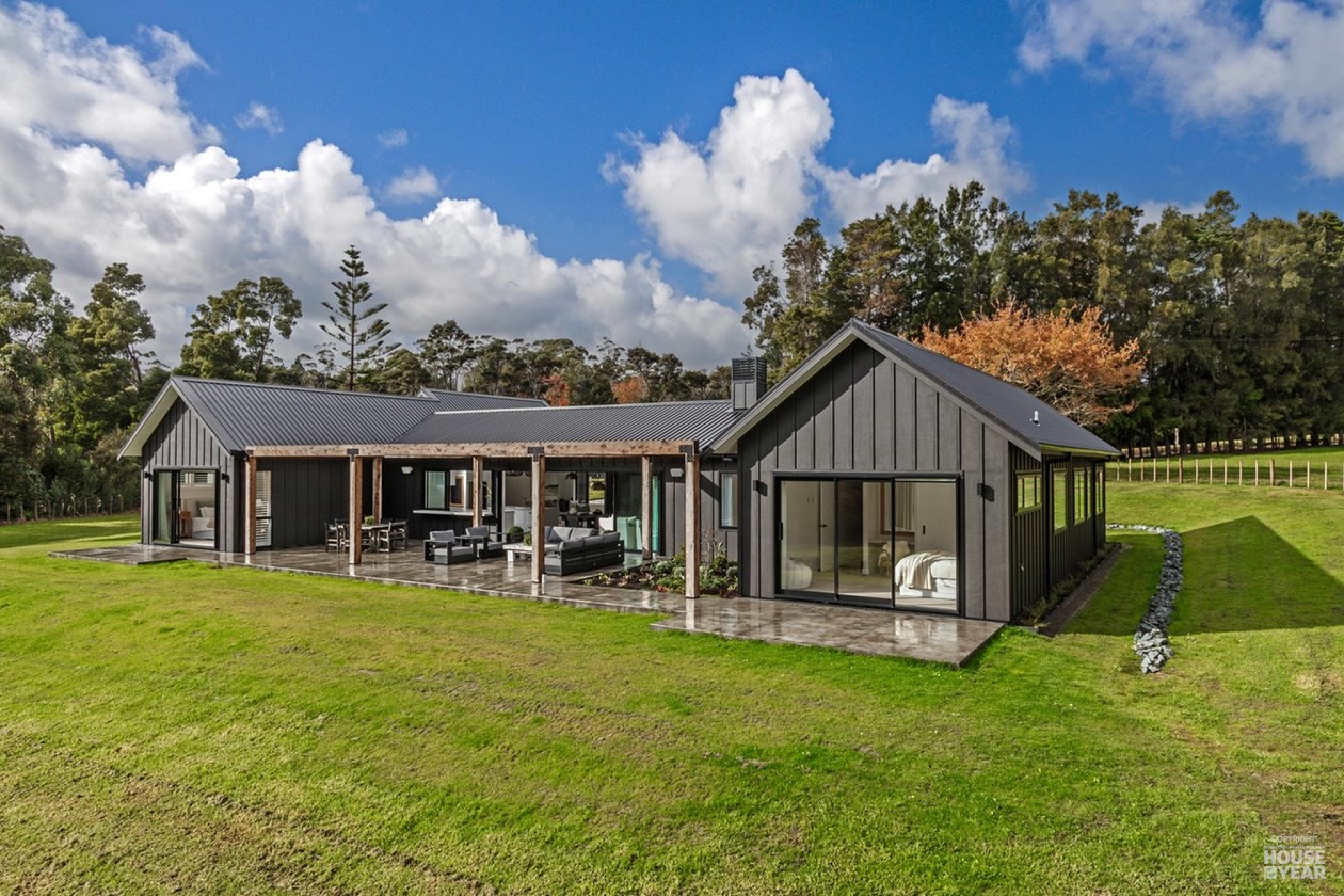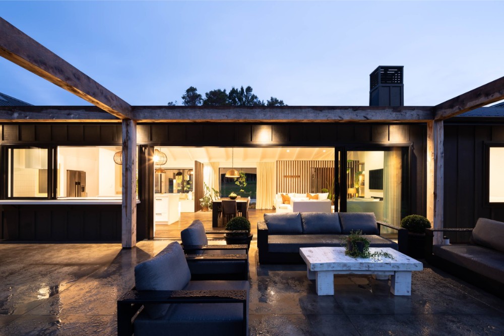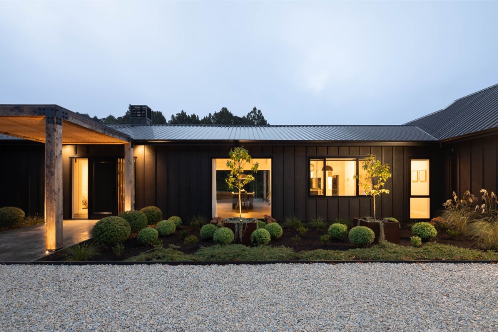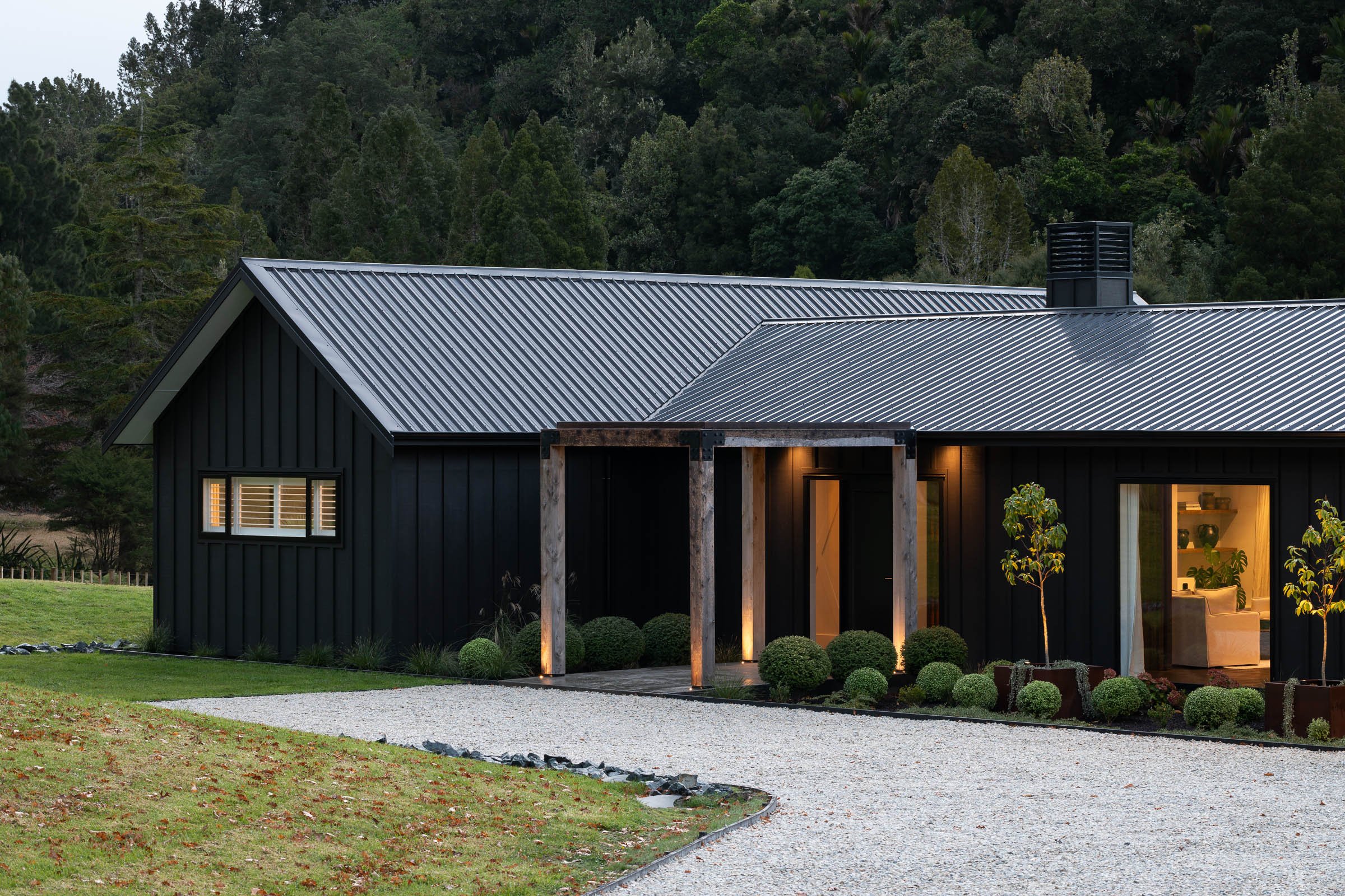 Set amidst lush, green surroundings in Coatesville, the home perfectly showcases the seamless balance of bold aesthetics and warm, inviting spaces. With striking black board-and-batten cladding, pitched gable roofs, and modern detailing, the design delivers a contemporary yet timeless appeal. The welcoming entry pergola sets the tone for what lies inside: open-plan living spaces, natural timber elements, and refined finishes.