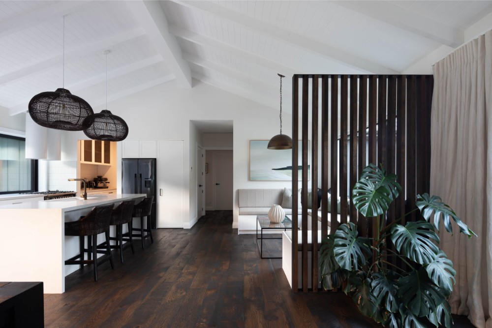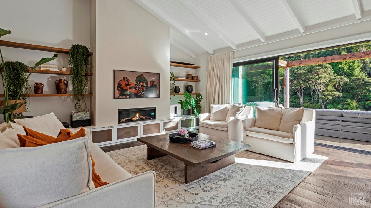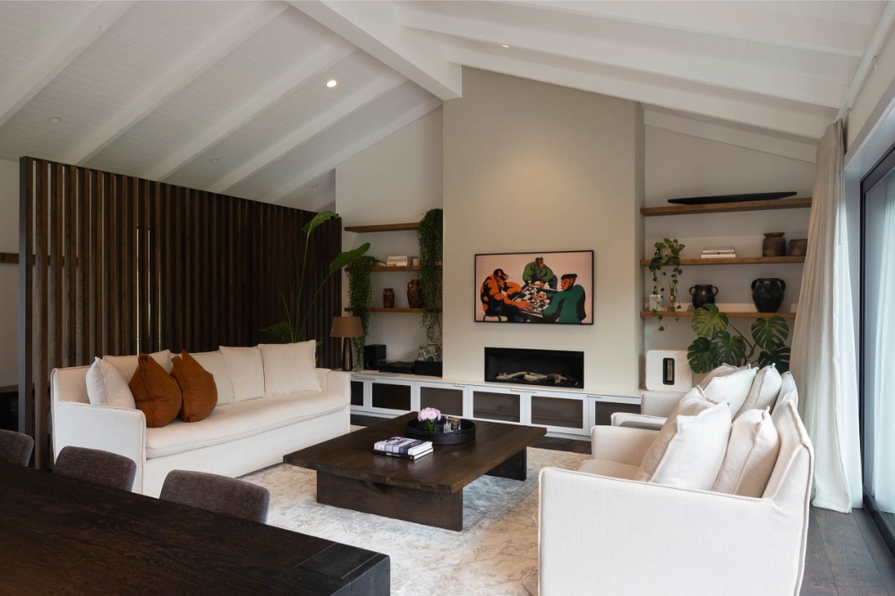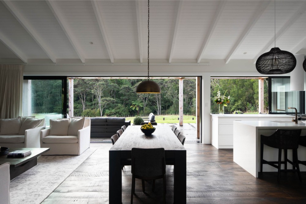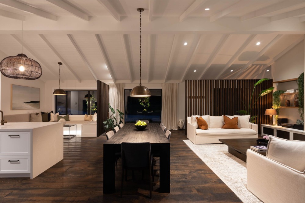 Set amidst lush, green surroundings in Coatesville, the home perfectly showcases the seamless balance of bold aesthetics and warm, inviting spaces. With striking black board-and-batten cladding, pitched gable roofs, and modern detailing, the design delivers a contemporary yet timeless appeal. The welcoming entry pergola sets the tone for what lies inside: open-plan living spaces, natural timber elements, and refined finishes.